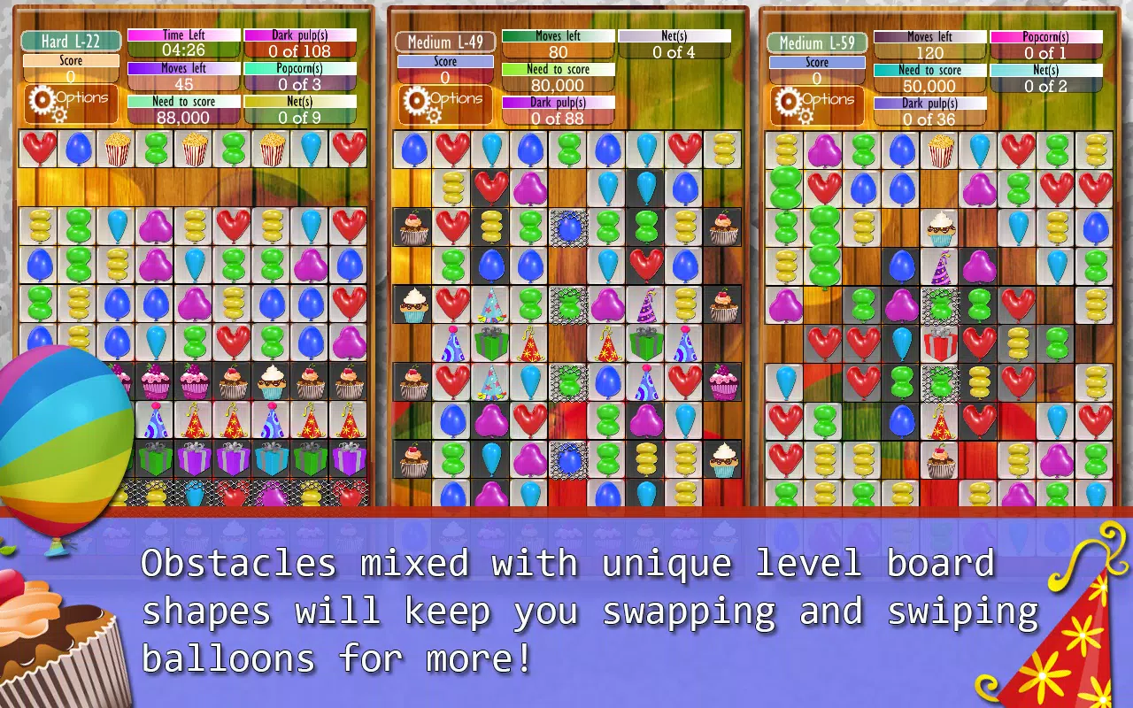 Each level in Balloon Drops is a unique puzzle, mixing obstacles with varied board shapes to keep you swiping and matching. From immovable party hats and cupcakes to netted balloons that require strategic matching, the game ensures you're always thinking ahead.