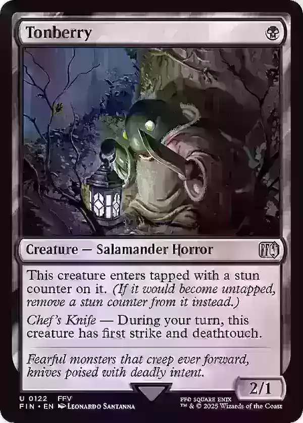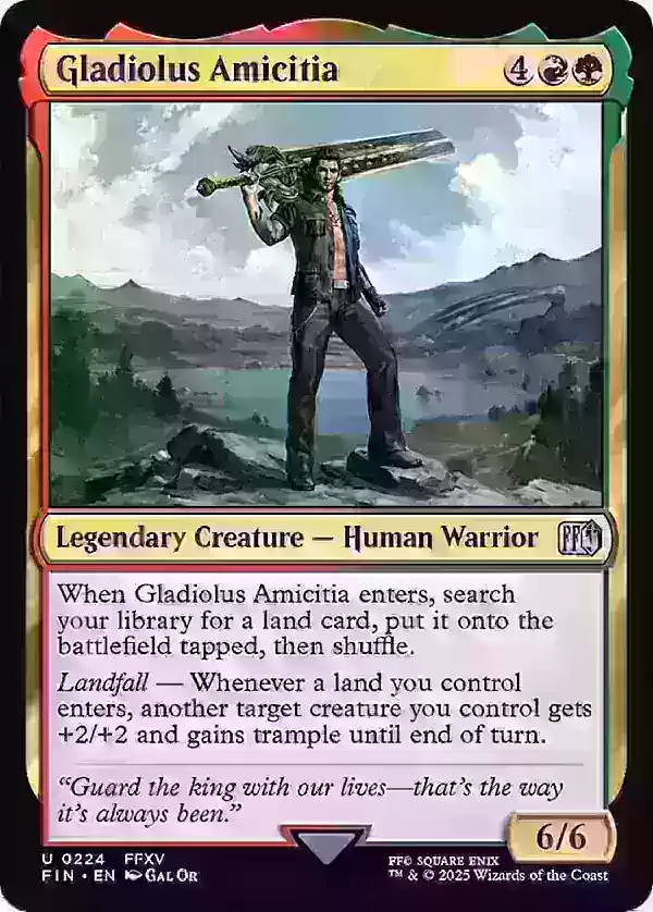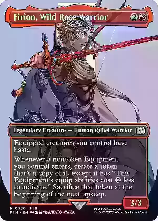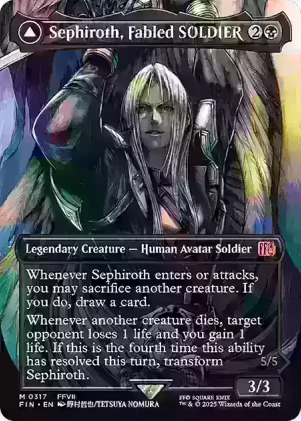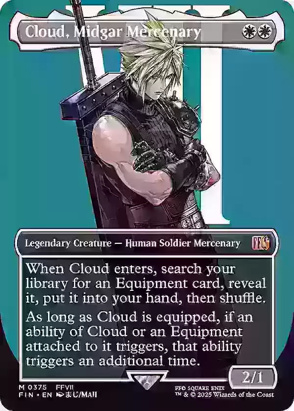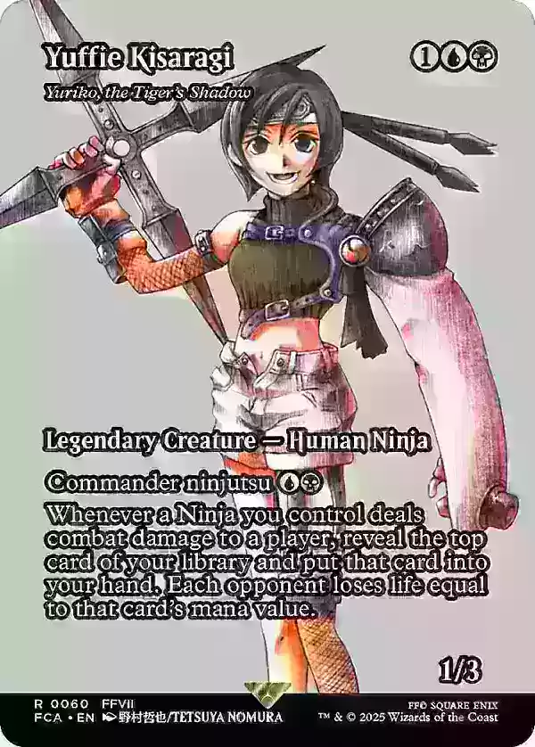 全画幅版本的"尤菲·如月 - 尤利子,虎之影"是另一张亮点卡牌,价格略低于100美元,这归因于其作为指挥官的有效性及其稀有度,特别是其经典的90年代末《最终幻想7》艺术风格。